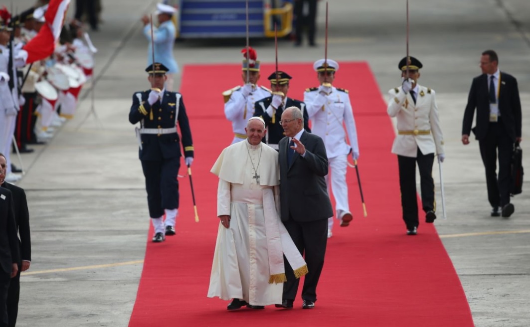 El santo padre recibió la bienvenida al Perú del presidente de la República, Pedro Pablo Kuczynski. En la alfombra roja especialmente acondicionada, el jefe del Estado, acompañado de su esposa, Nancy Lange, esperó el descenso del papa de la aeronave para darle la bienvenida a nombre de la Nación y del Estado peruano.