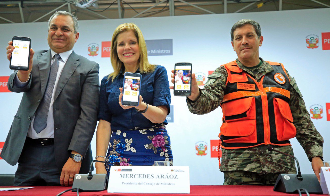 La Titular de la Presidencia del Consejo de Ministros, Mercedes Aráoz, junto con el jefe del Instituto Nacional de Defensa Civil y el ministro del Interior, Vicente Romero, presentaron un aplicativo móvil informativo para resolver las dudas durante la visita papal.