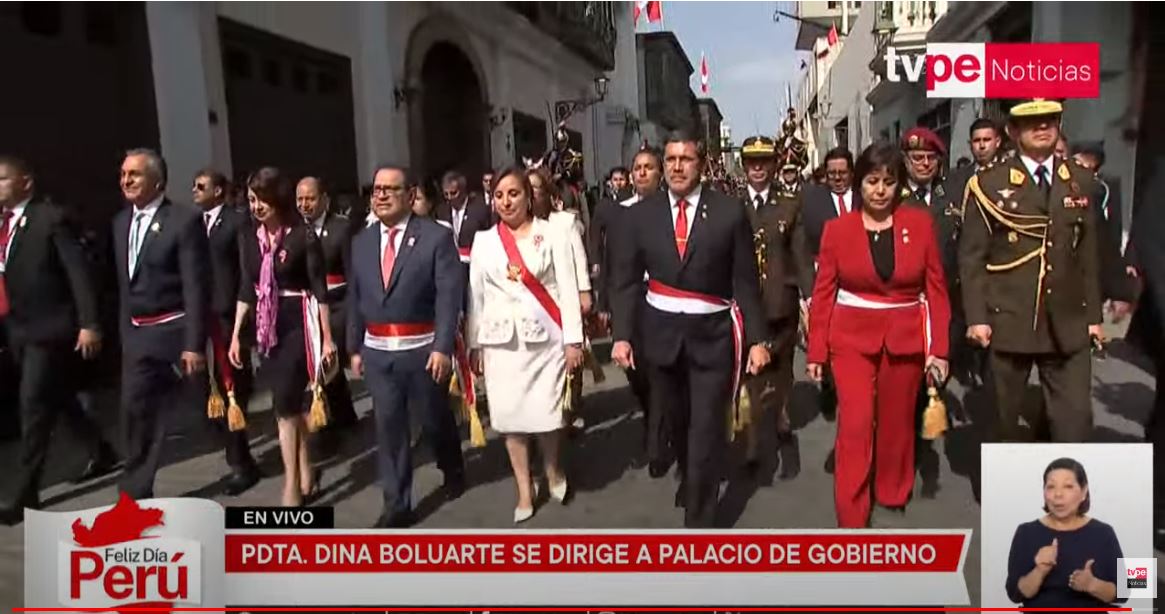 La presidenta Dina Boluarte retornó a Palacio de Gobierno caminando junto a su gabinete ministerial luego de dirigir su mensaje a la nación por 28 de julio. Foto: TVPerú Noticias.