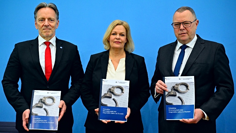 La ministra del Interior, Nancy Faeser (centro), alado del presidente de la Oficina Federal de Policía Criminal, Holger Muench (i), y el ministro del Interior de Brandeburgo, Michael Stuebgen (derecha), mientras presentan las estadísticas criminales de Alemania para 2023, el 9 de abril de 2024 en Berlín. Foto: AFP.