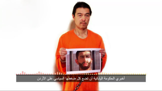 En un video publicado este martes en Internet aparece el rehén japonés Kenji Goto sujetando una foto del piloto jordano Muaz Kasasbeh, que fue secuestrado en Siria en octubre pasado.