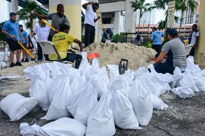 Voluntarios de la ciudad de Miami llenan sacos de arena para ayudar a los residentes a prepararse para la llegada del huracán Milton. Foto: AFP.