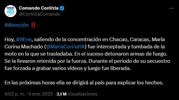 "Fue interceptada y tumbada de la moto en la que se trasladaba. En el suceso detonaron armas de fuego. Se la llevaron retenida por la fuerza. Durante el periodo de su secuestro fue forzada a grabar varios vídeos y luego fue liberada", indicó su equipo político en una publicación en la red social X, que señala que la opositora hablará "en las próximas horas".