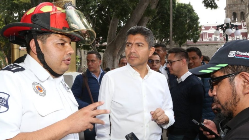 Bomberos junto con Eduardo Rivera Pérez, Presidente Municipal de Puebla (en el centro), evaluando daños. Foto: enlineapuebla.