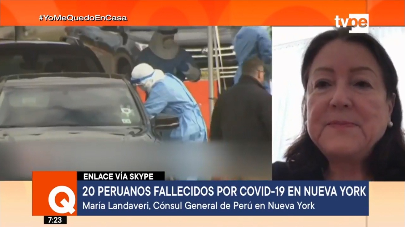 En entrevista con “Qué está pasando” de TVPerú Noticias, la cónsul general del Perú en Nueva York, María Landaveri, informó que, hasta la fecha, 20 compatriotas han fallecido por COVID-19 en la mencionada ciudad estadounidense.