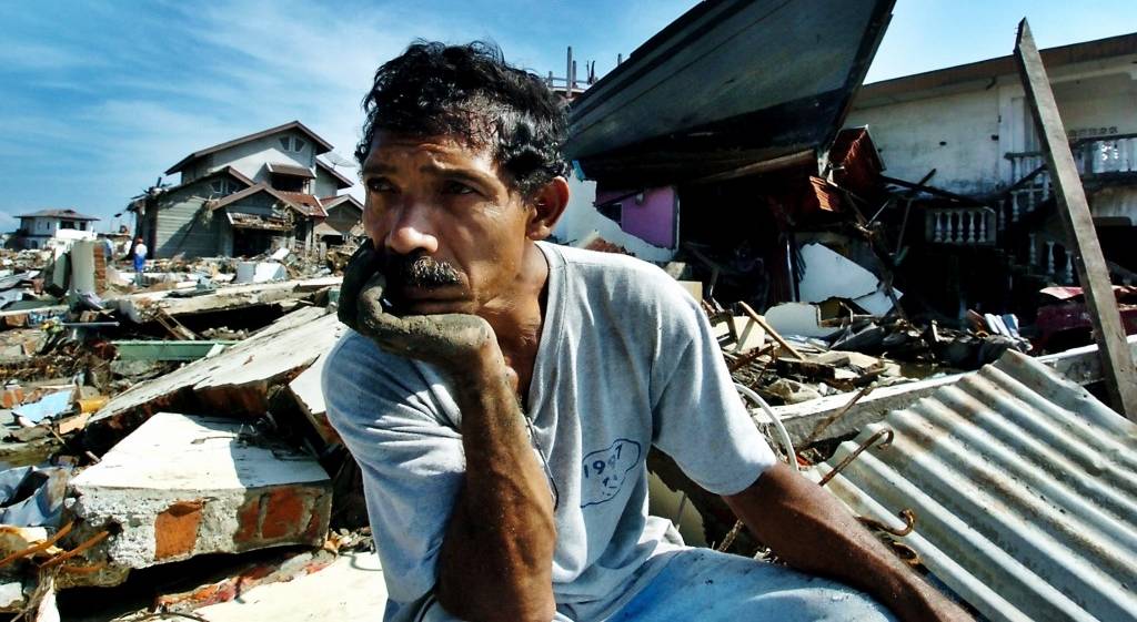 Hombre indonesio descansa entre los escombros de lo que solía ser su casa devastada por un terremoto y posterior tsunami. Foto: AFP/15 de enero del 2005.