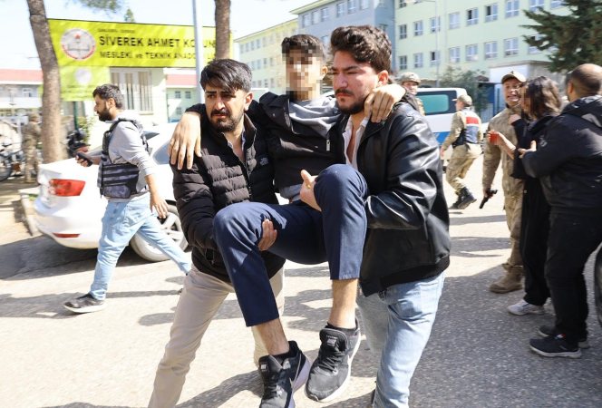 Un estudiante herido evacuado mientras las fuerzas especiales de seguridad rodeaban la escuela en el sureste de Turquía. Foto: AFP.