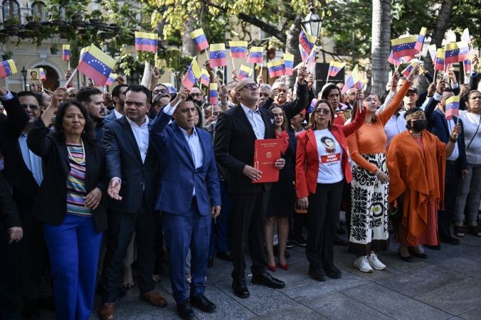 El presidente del Congreso, Jorge Rodríguez (centro), sostiene un proyecto de ley aprobado por los legisladores que codifica las sanciones económicas como un crimen contra la humanidad. Foto: AFP.
