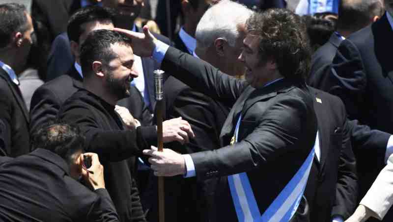 Zelenski participó este domingo en la ceremonia de toma de mando de Milei y cuando el nuevo presidente de Argentina salió a dar su discurso de asunción en la escalinata del Congreso, ambos se saludaron y abrazaron, intercambiaron unas palabras y se despidieron con un nuevo abrazo.