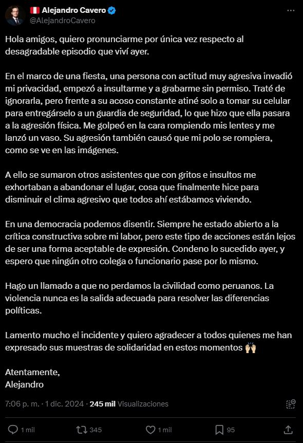 En un pronunciamiento, Cavero hizo llamado a la ciudadanía a mantener la civilidad y evitar que situaciones como esta continúen. "Hago un llamado a que no perdamos la civilidad como peruanos", expresó el congresista.