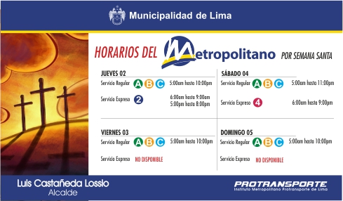 El servicio del Metropolitano tendrá un horario especial durante la Semana Santa, informó Protransporte, que exhortó a los usuarios tomar las previsiones del caso teniendo en cuenta el funcionamiento de los servicios y la frecuencia de viajes que tendrá ese medio de transporte.