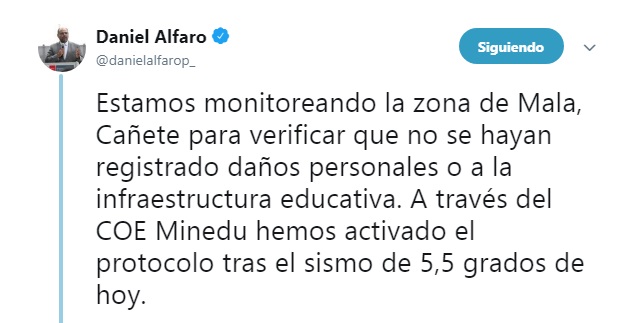 A través de su cuenta de Twitter, agregó que el Minedu ha activado el protocolo tras el sismo de 5,5 grados registra hoy.