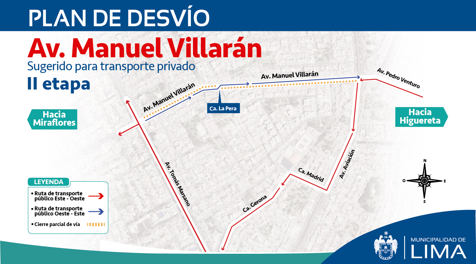 Los trabajos contemplan el tramo desde Av. Aviación hasta la calle La Pera, por lo que el desplazamiento de los vehículos será por la Av. Villarán en el sentido oeste – este desde la Av. Tomás Marsano hasta la calle La Pera, para luego tomar el carril contrario hasta la Av. Aviación, haciendo recorrido por la nueva vía construida.