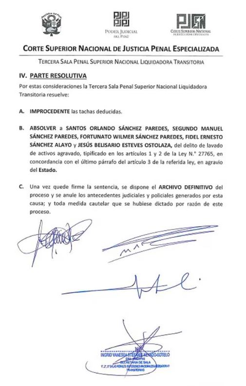 De esta manera, el fallo en primera instancia ordenó se archive definitivamente el proceso contra Santos Orlando, Segundo Manuel y Fortunato Wilmer Sánchez Paredes, el sobrino Fidel Ernesto Sánchez Alayo y el administrador Jesús Esteves Ostolaza.
