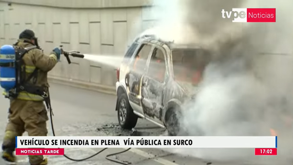 Un auto se incendió este sábado en plena vía pública, en el distrito de Santiago de Surco. El incidente se habría producido por un desperfecto en el vehículo, el cual habría ocasionado un corto circuito.