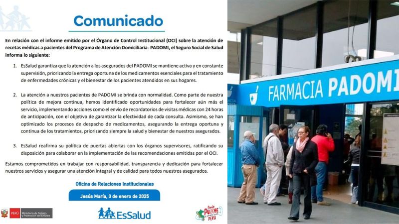 EsSalud se dirigió al Órgano de Control Institucional (OCI) sobre la atención de recetas médicas a los pacientes del Padomi para informar que los asegurados están siendo atendidos. Además, recalcó que la atención a los asegurados del Padomi se mantiene activa y bajo constante supervisión, con prioridad en la entrega oportuna de medicamentos esenciales para el tratamiento de enfermedades crónicas.