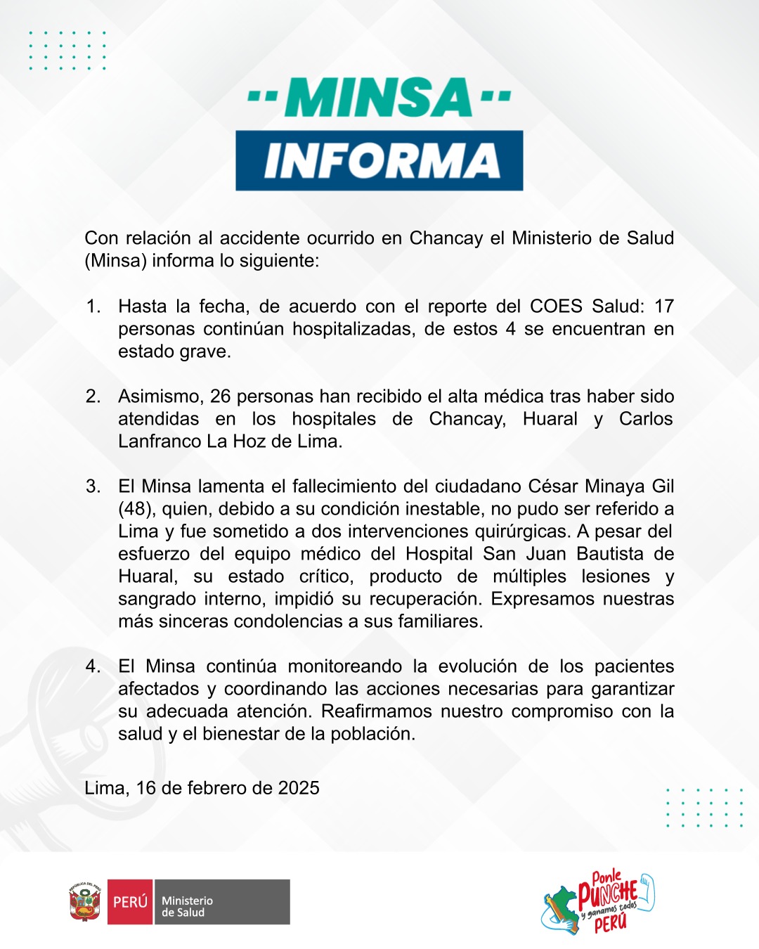“El Minsa continúa monitoreando la evolución de los pacientes afectados y coordinando las acciones necesarias para garantizar su adecuada atención. Reafirmamos nuestro compromiso con la salud y el bienestar de la población”, concluye el comunicado del Minsa.