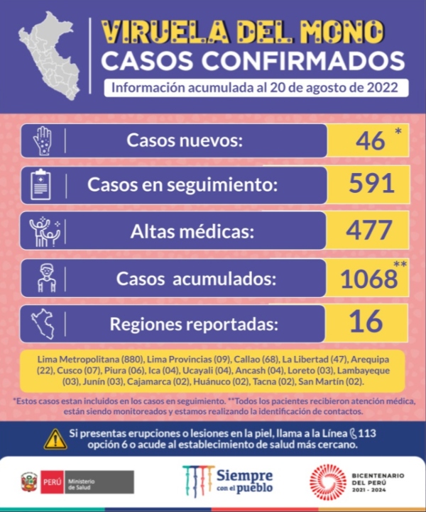 El número de casos de viruela del mono confirmados en el Perú se elevó a 1 068, así lo informó el Ministerio de Salud (Minsa). Señaló que se han registrado 46 contagios más que en el anterior reporte.