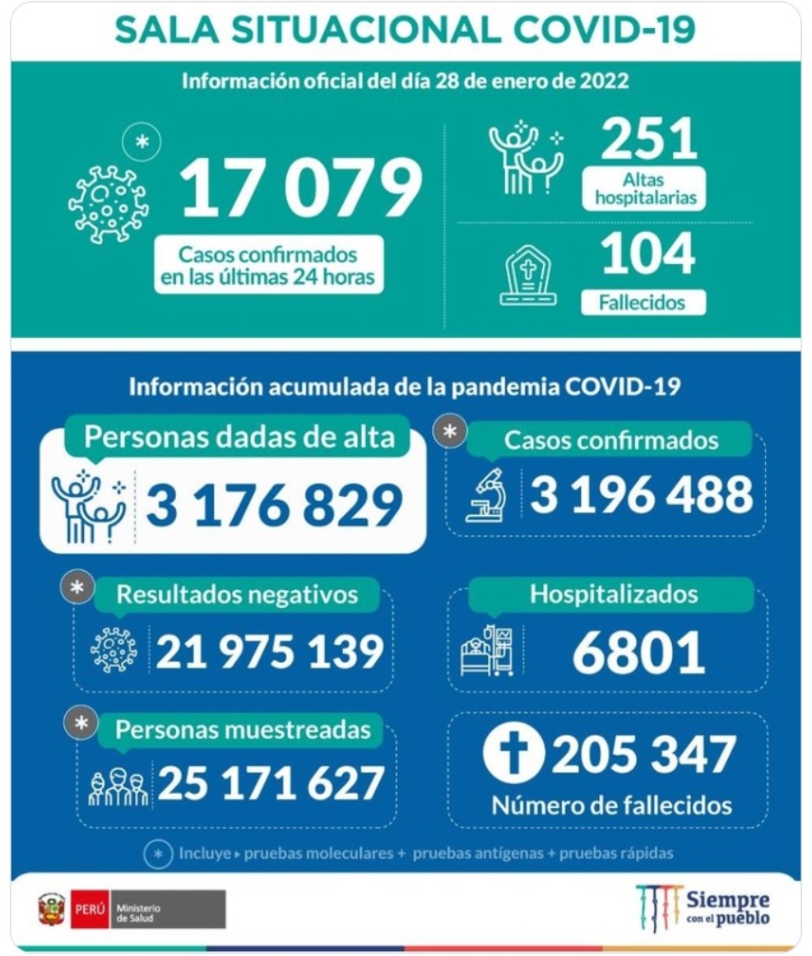 El último comunicado del Ministerio de Salud (Minsa) dio a conocer que tras 25 171 627 personas muestreadas, a través de pruebas moleculares y serológicas o rápidas, 3 196 488 dieron positivas por COVID-19.