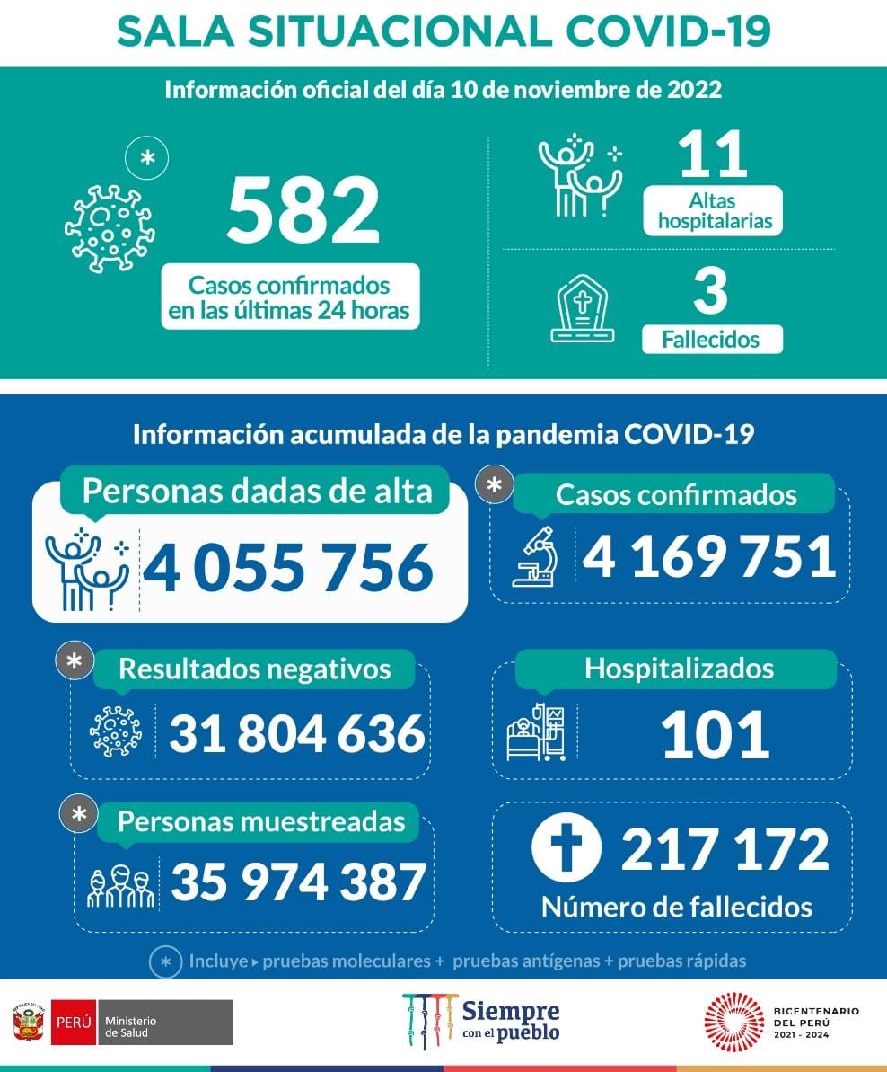 “Durante el 10 de noviembre se registraron 35 778 los resultados de personas muestreadas, de los cuales 582 fueron casos sintomáticos confirmados de ese día. Se registraron parcialmente, además, los resultados de 2461 casos confirmados por COVID-19 de los siete días anteriores”, precisa el comunicado.