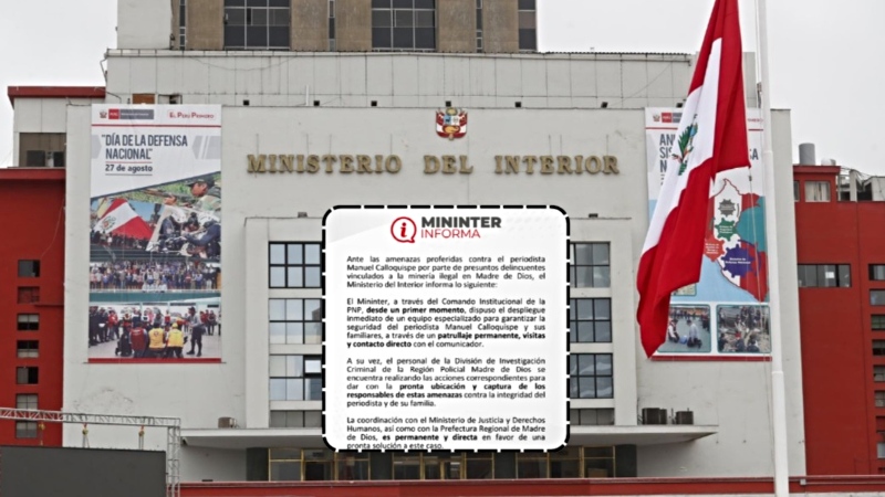 El Ministerio del Interior (Mininter) comunicó que dispuso el despliegue inmediato “de un equipo especializado” de la Policía Nacional (PNP) para garantizar la seguridad del periodista Manuel Calloquispe y de sus familiares, mediante “un patrullaje permanente, visitas y contacto directo con el comunicador”.
