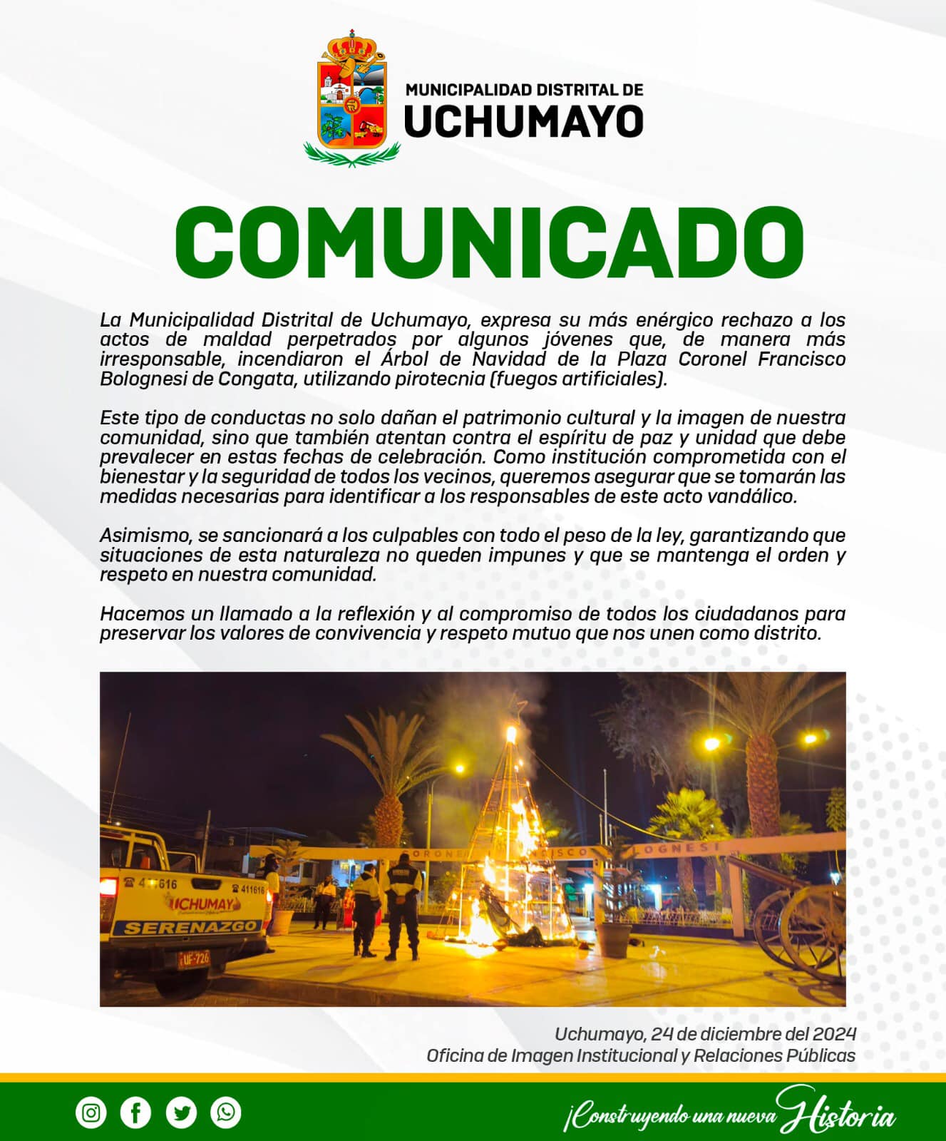 “La Municipalidad Distrital de Uchumayo, expresa su más enérgico rechazo a los actos de maldad perpetrados por algunos jóvenes que, de manera más irresponsable, incendiaron el Árbol de Navidad de la Plaza Coronel Francisco Bolognesi de Congata, utilizando pirotecnia (fuegos artificiales)”, dice el comunicado edil.