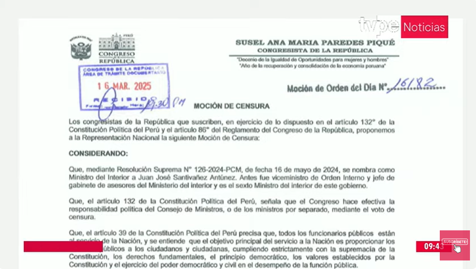 Esta mañana, presentaron ante la mesa de partes del Congreso de la República una moción de censura contra el ministro del Interior, Juan José Santiváñez, impulsada por la parlamentaria del Bloque Democrático Popular, Susel Paredes.