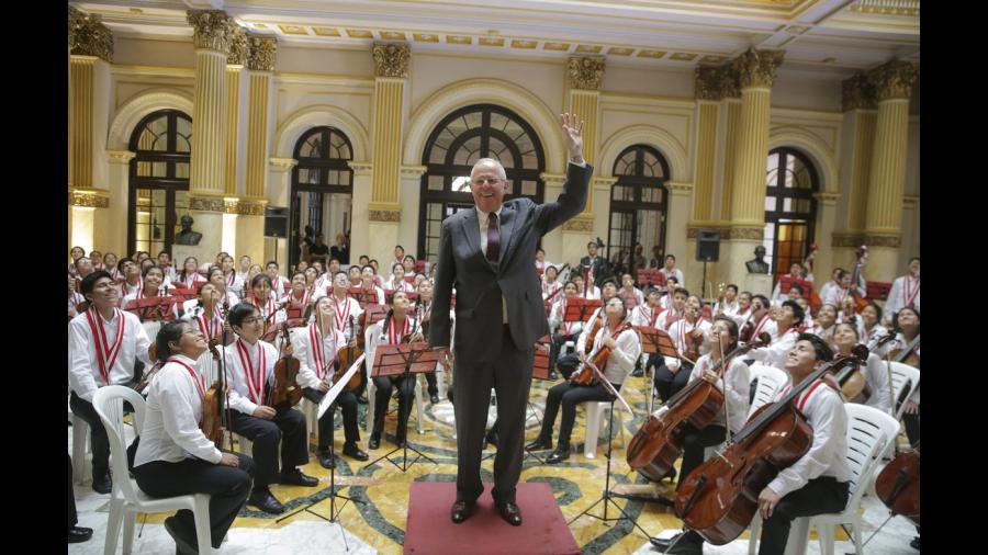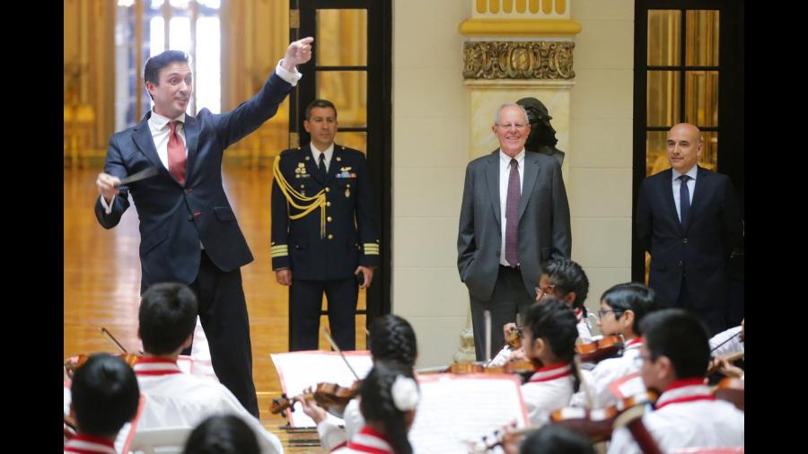 En las instalaciones de Palacio de Gobierno, el presidente de la República, Pedro Pablo Kuczynski, recibió hoy la grata visita de la orquesta sinfónica prejuvenil "Sinfonía por el Perú", dirigida por por Hugo Carrio.