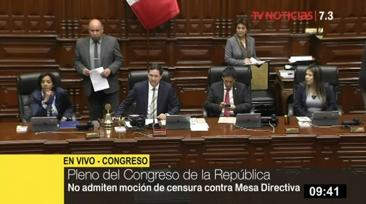 El Pleno del Congreso de la República decidió no admitir a debate la moción de censura (Nº 7171) que presentaron las bancadas de Nuevo Perú, Peruanos por el Kambio, Frente Amplio, Alianza por el Progreso y no agrupados, en contra de la Mesa Directiva que preside Daniel Salaverry e integran Leyla Chihuán, Segundo Tapia y Yeni Vilcatoma.