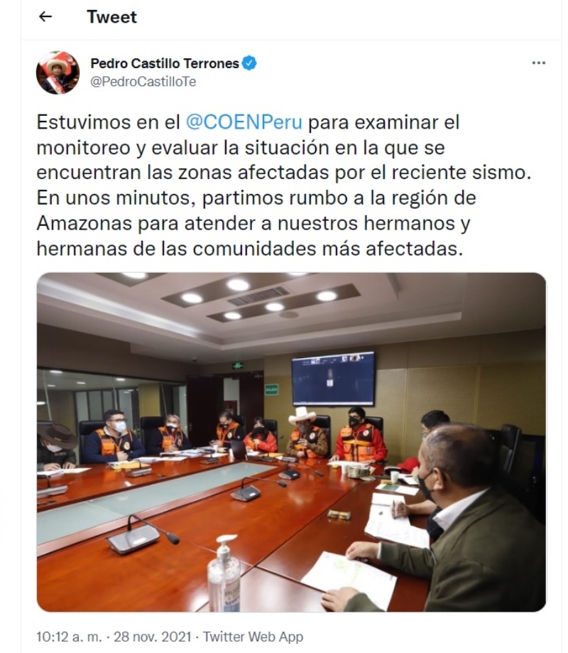 Presidente Castillo tras sismo en Amazonas: estamos viajando para atender a nuestros hermanos y hermanas de las comunidades más afectadas