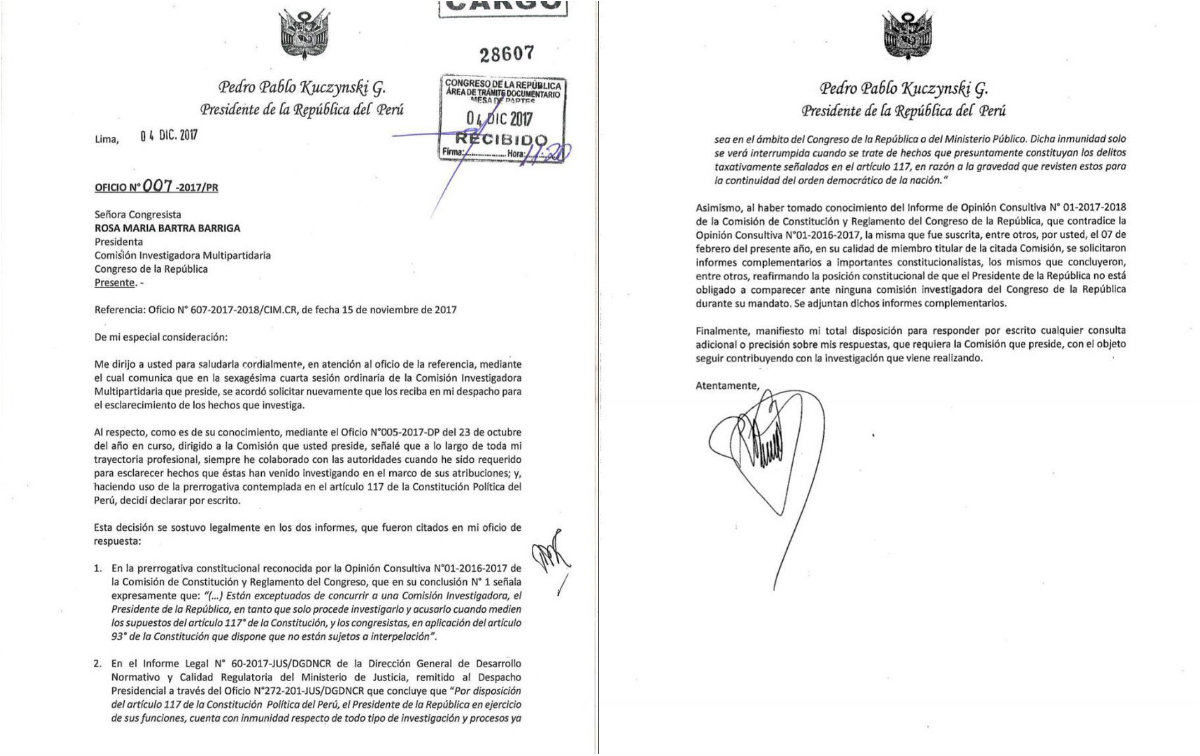El mandatario Pedro Pablo Kuczynski ratificó hoy su total disposición de responder a la Comisión Lava Jato del Congreso de la República, y envió dos informes que reafirman que no está obligado a comparecer ante una comisión investigadora del Parlamento durante su mandato.
