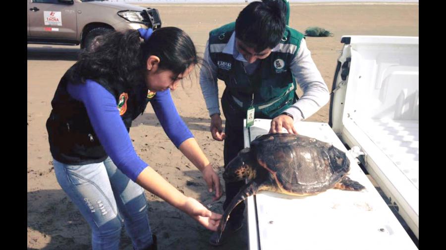 Especialistas de la Administración Técnica Forestal y de Fauna Silvestre (ATFFS) Moguegua-Tacna salvaron la vida a una tortuga marina (Caretta caretta) hallada en la playa Los Palos, ubicada en la región Tacna que tenía una fuerte lesión en una de sus aletas al haberse enredado con un costal.