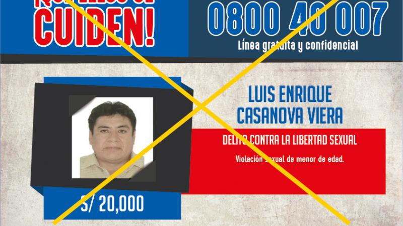 El Programa de Recompensas con su campaña “Que ellos se cuiden”, impulsado por el Gobierno, sigue mostrando su efectividad. Luis Enrique Casanova Viera (60) fue capturado en el distrito de San Juan de Lurigancho por el delito de violación a una menor de edad en Piura.
